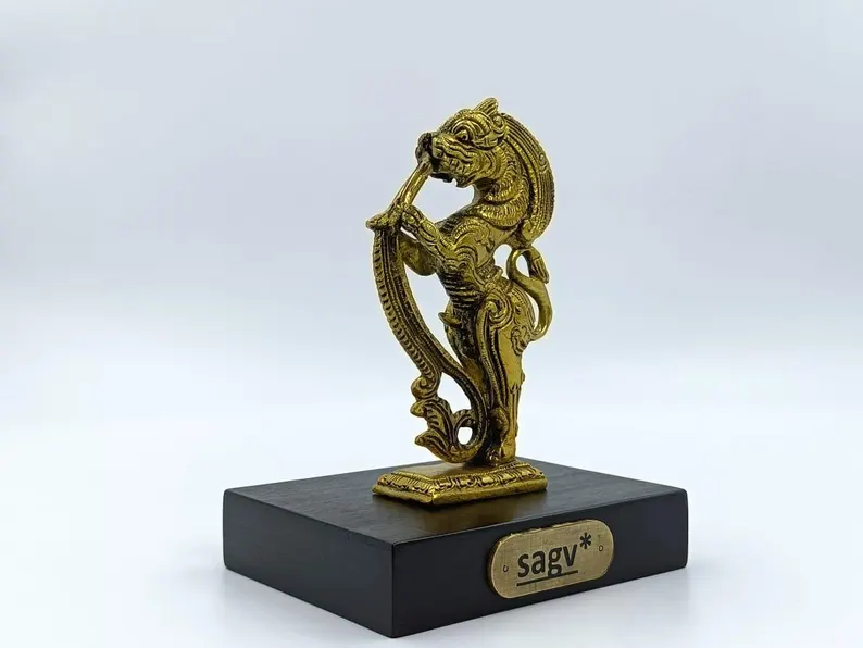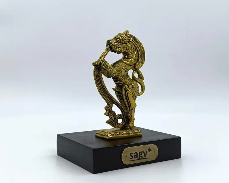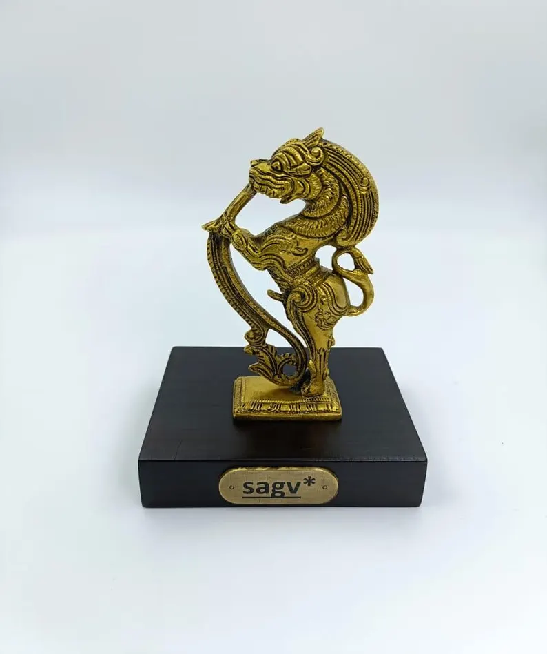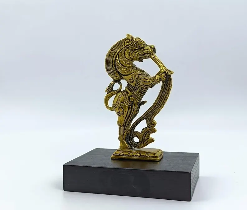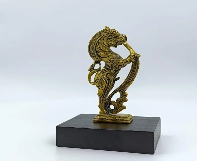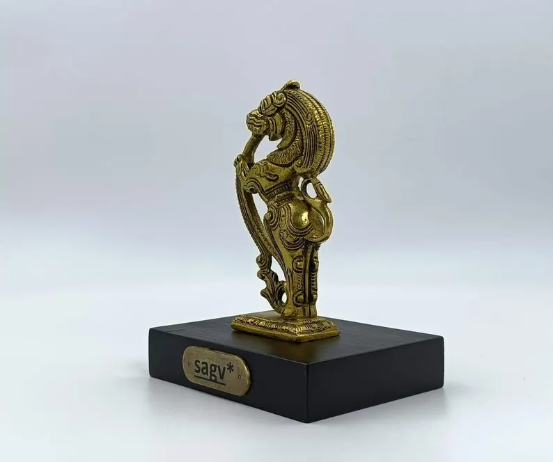 This beautifully crafted Yali sculpture is made from high-quality brass and set on a sturdy wooden base. Measuring 11.5 cm in width, 9 cm in depth, and 15 cm in height, it symbolizes strength and protection, making it a perfect piece for traditional home décor, gifting, or creating a spiritual ambiance.