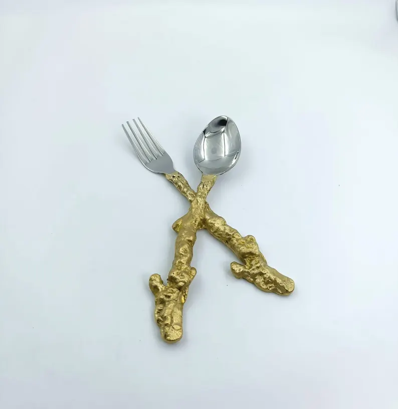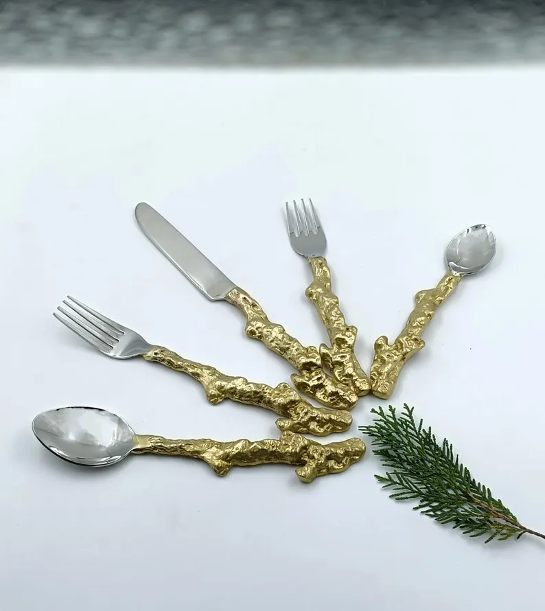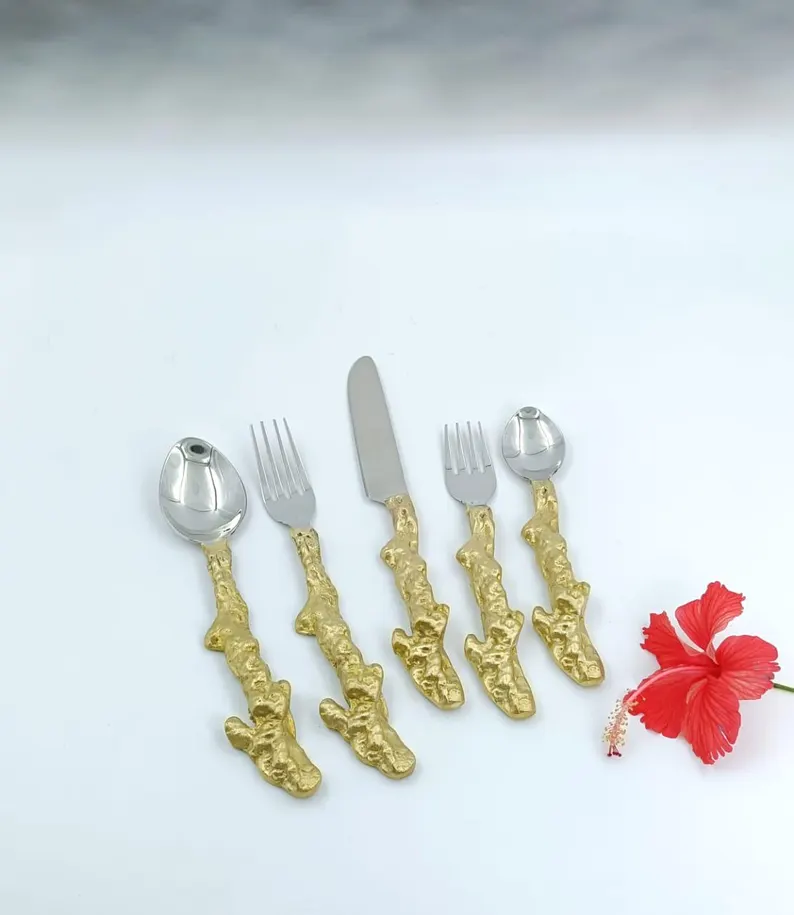 Modern Fusion Cutlery Set, Brass and Steel Tableware with Minimal Elegance for Contemporary Dining.